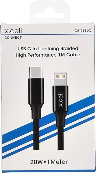 X.cell 211LC, Type C to Lightning Braided Cable (1M/3.3FT), With 3Amp Power Capacity, Black, XL-CB-211LC-BLK, HDMI